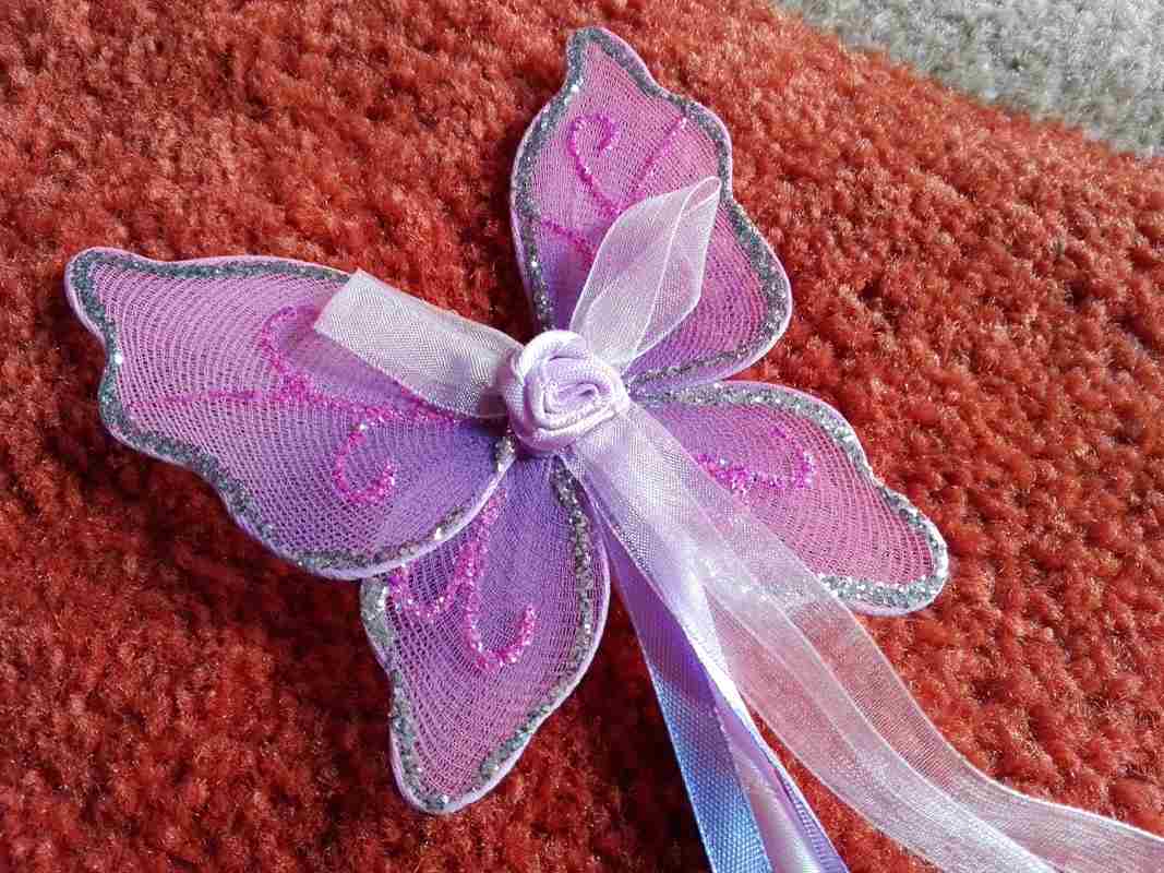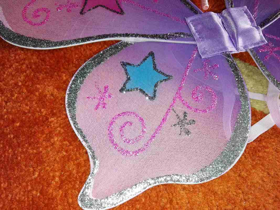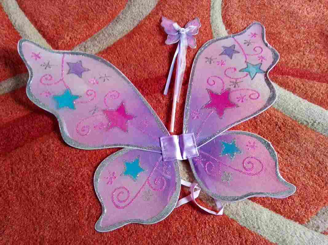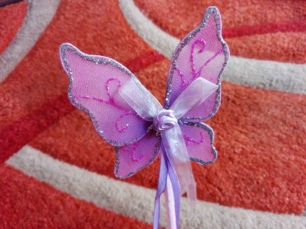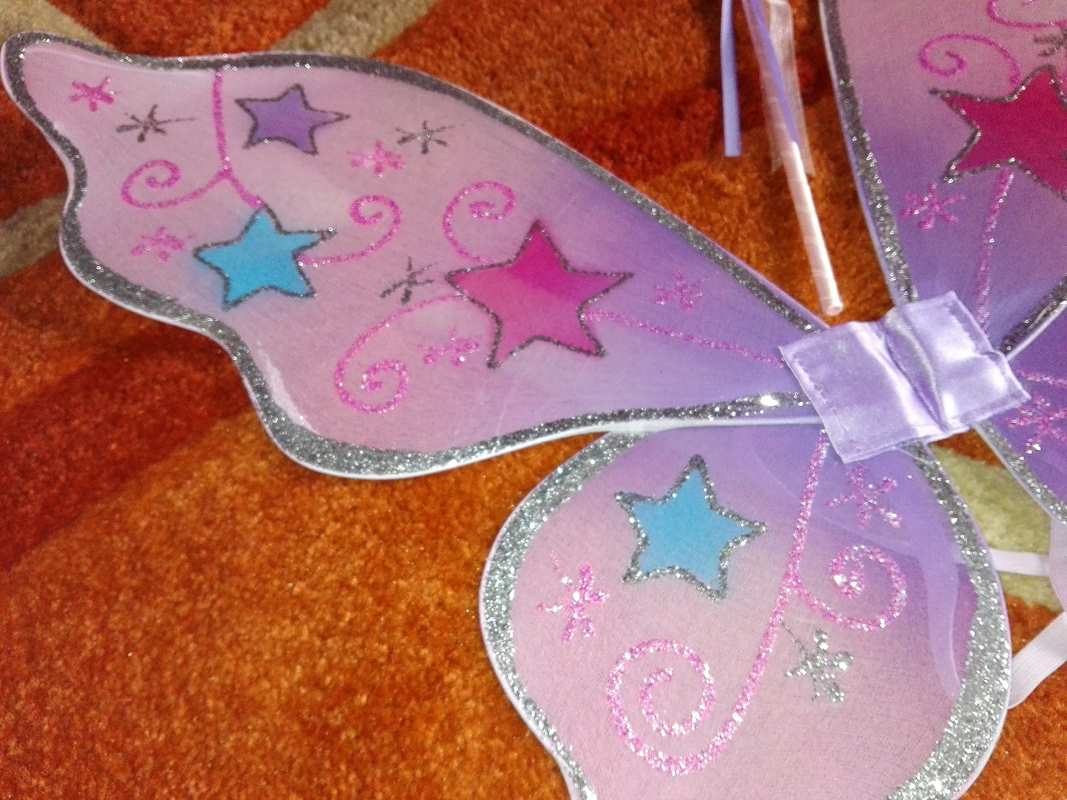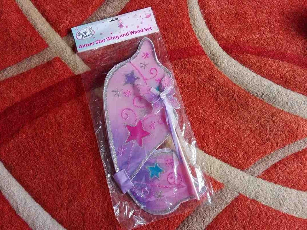 Il set di ali da fata e bacchetta magica di Lucy Locket lo adoro!!! E' una piccola meraviglia fatata, uno di quei piaceri che non si può assolutamente negare a una bambina che voglia giocare a fare la Winx. Dovreste vedere con quanta gioia "svolazza" per casa con le sue belle ali viola. E quanti incantesimi con la sua scintillante bacchettina magica. Le ali (52 x 47 cm circa) sono in tessuto (credo nylon) viola, intorno a un'anima che le sostiene. Leggere, ma resistenti sono decorate con stelline e ghirigori glitterati e si indossano grazie a due elastici (come uno zainetto, per intenderci). La bacchetta magica (30 cm circa) è, a sua volta, una piccola farfallina che riprende forma e motivo decorativo delle ali. In più è decorata con una rosellina in tinta da cui si dipartono dei nastrini che, con i loro scintillii, la rendono più magica. La bacchetta è interamente ricoperta da un nastro di raso lilla.