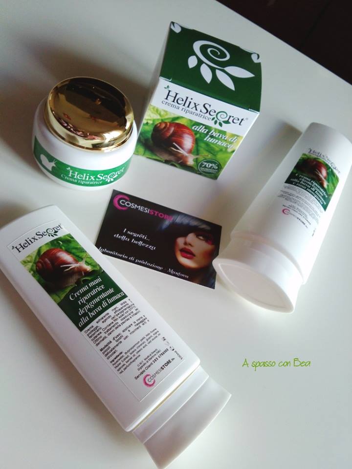 Cosmesistore è lo store online di G.M.F. Medical Beauty che, da quasi un ventennio, si occupa di ricerca e produzione di linee cosmeceutiche utilizzando nanotecnologie ed estrazioni biologiche. Da questa lunga esperienza nasce la linea che voglio presentarvi, Helix Secret, a base di bava di lumaca. Vi prego, non fate quella faccia!!! Nulla di viscido o dall'odore spiacevole, anzi, i cosmetici della linea Helix Secret presentano una texture morbida e cremosa molto leggera, dalla profumazione naturale piacevolissima. Il segreto della loro efficacia garantita è l'estratto di Bava di Lumaca (Helix Aspersa muller extract), quella scia che le chioccioline lasciano quando si spostano che è naturalmente ricca di preziosi principi attivi come collagene, allontoina, acido glicolico, elastina, vitamine e proteine. I suoi benefici applicati alla cosmetica sono numerosi per via del suo potentissimo potere riparatore epiteliale in grado di prevenire le rughe, combattere l'acne, riparare i tessuti cicatrizzando le ferite, attenuare o prevenire ruge, smagliature, macchie cutanee, trattare scottature, herpes e psoriasi.