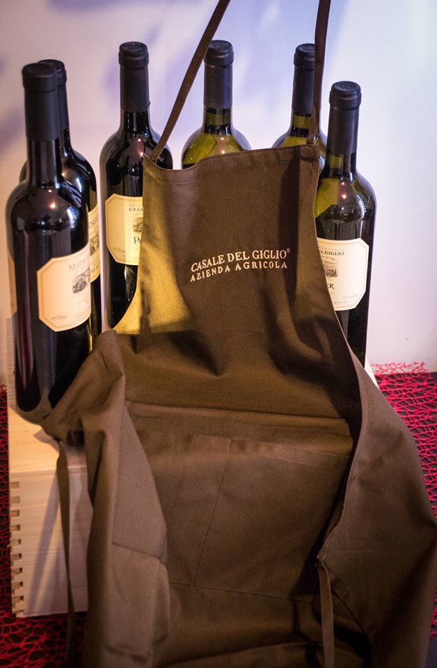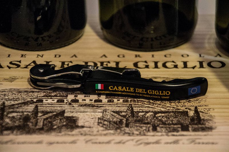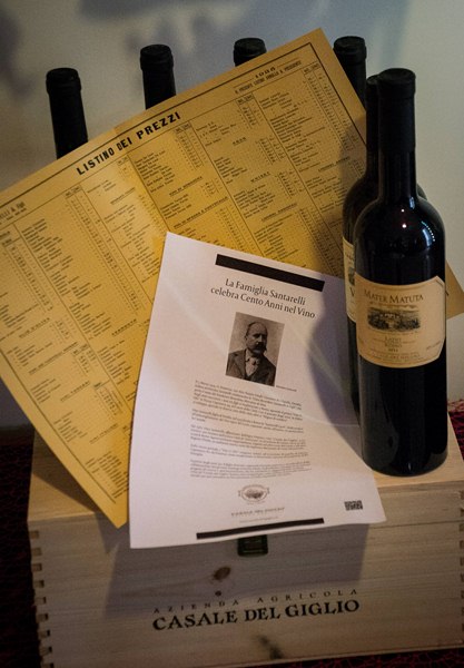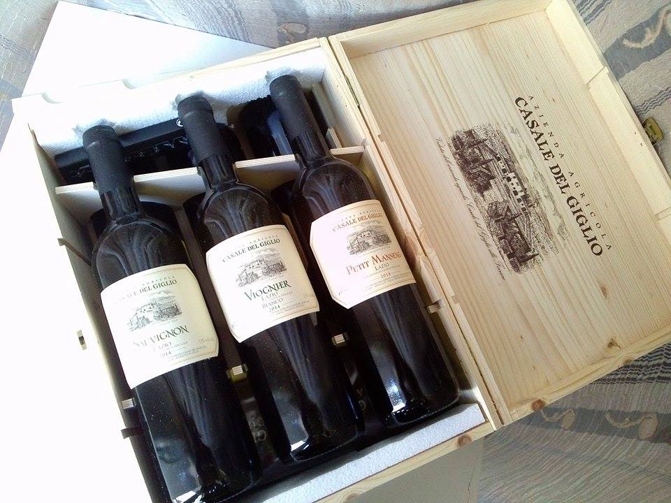 Nella splendida cassa di legno con impressa l'etichetta raffigurante Casale del Giglio, l'azienda mi ha fatto omaggio di sei bottiglie dei suoi vini più pregiati, di un grembiule e un cavatappi che hanno dato modo a mio marito di pavoneggiarsi di fronte agli amici, di un DVD sui cento anni di esperienza nel campo vinicolo della famiglia Santarelli e di vari depliant informativi. Ma andiamo ai vini, che rappresentano il nodo centrale.