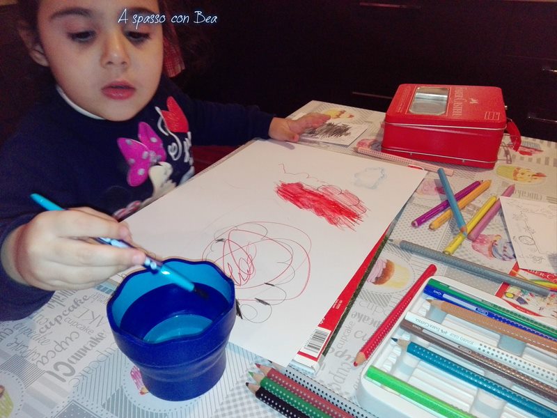 Bea sta cominciando a sbocciare nell'arte del disegno ed in una fase di scoperta del colore, soprattutto adesso, perché i pastelli colour GRIP contenuti nella bellissima valigetta rossa in alluminio sono acquerellabili e possono essere sfumati con un pennellino, cosa che a Bea piace fare tantissimo. La entusiasmano il pennellino a scomparsa e lo speciale bicchiere richiudibile contenuti nel set e i suoi cieli azzurri e prati verdi sono i più belli che abbia mai visto. Tenere in mano i pastelli colorati è semplice e comodo, grazie allo speciale fusto ergonomico triangolare e agli speciali pallini gommati che migliorano la presa.