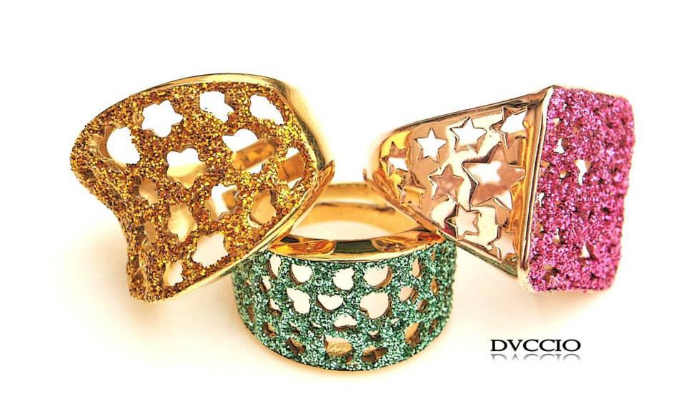 Dvccio propone anche altre linee di gioielli, come per esempio questi anelli sempre in bronzo placcato oro 24 kt e cosparsi di microglitter, disponibili in colori diversi: una novità assoluta nel panorama della gioielleria.