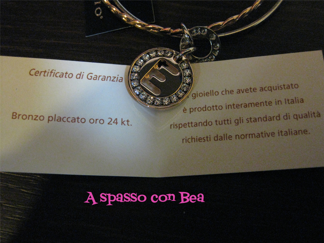 Il bracciale è ancora più particolare: è, anch'esso, in Bronzo puro placcato Oro 24 kt e si compone di due cerchi rigidi (quindi molto pratico e veloce da indossare): uno semplice, placcato in oro bianco, l'altro è un intreccio di due elementi placcato in oro rosa. I due vengono tenuti insieme dalla medaglietta rotonda, anch'essa placcata in oro rosa, recante l'iniziale del mio nome, la E di Eleonora. L'iniziale, poi, è realizzata con la tecnica del traforo e circondata da una fila di cristalli svarowsky pieni di magici bagliori.