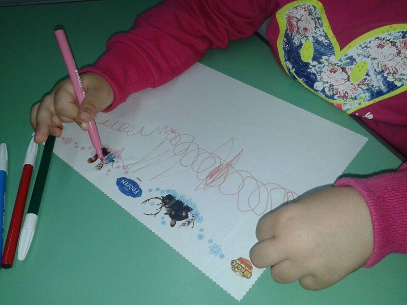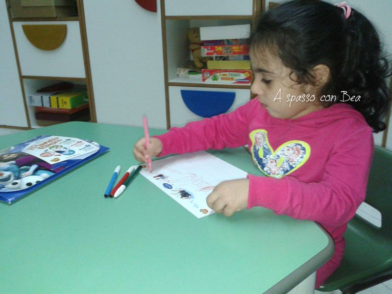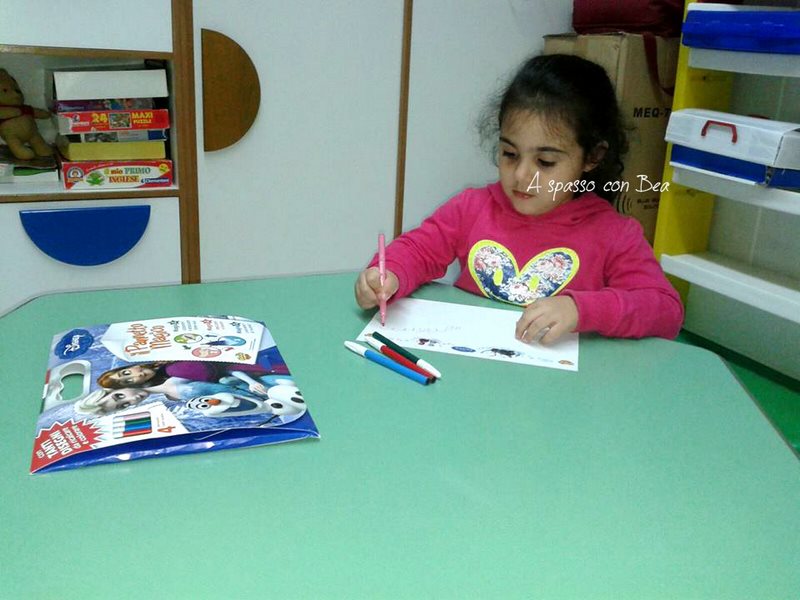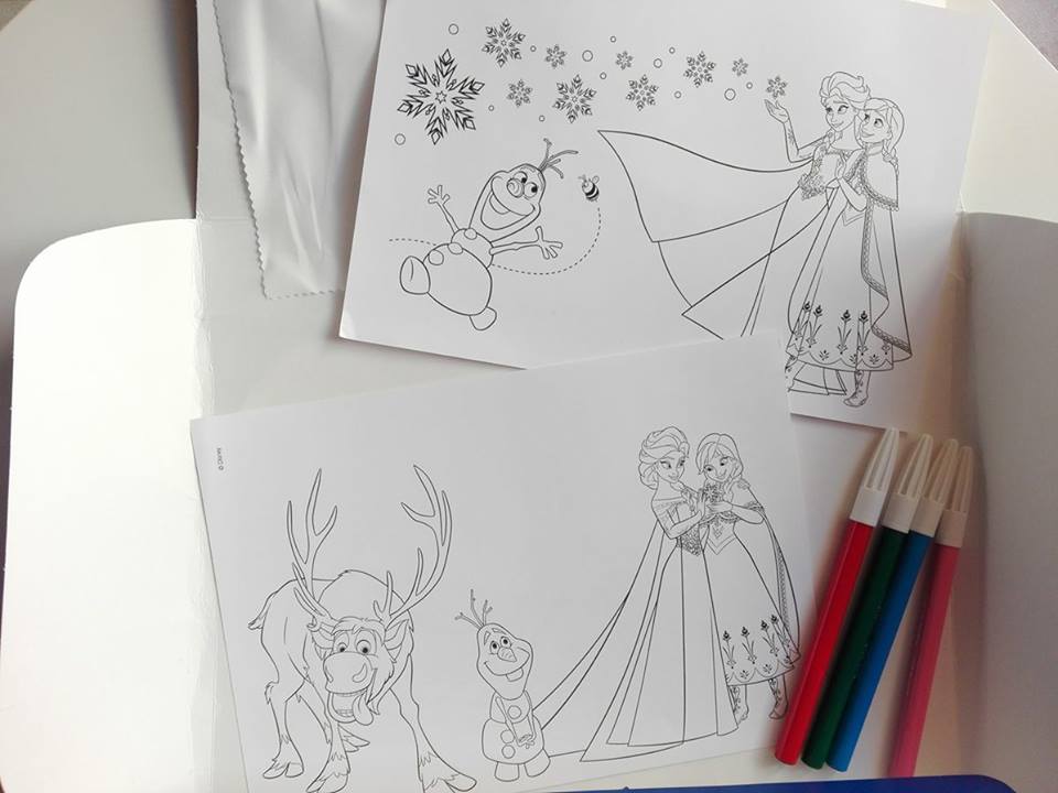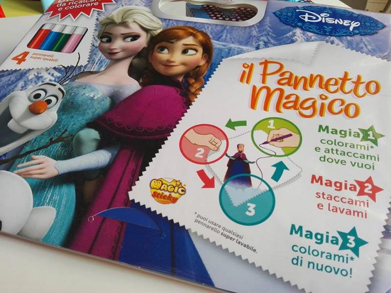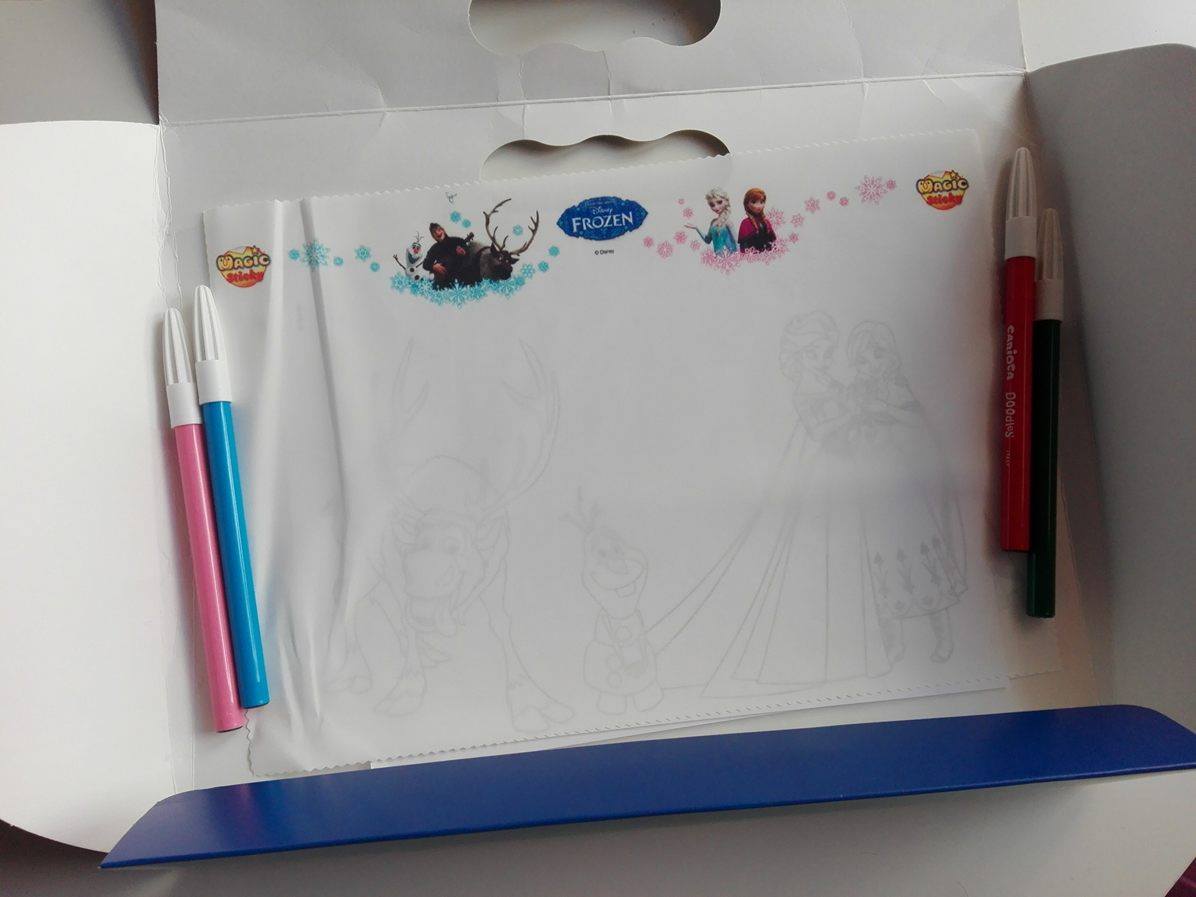 Bea ha la box di Frozen, una graziosa valigetta in cartone che contiene un pannetto magico (31 x 25 cm), dei disegni ispirati all'amatissimo film di animazione da ricalcare e 4 pennarelli lavabili. Bea è ancora piccola e non riesce a usarlo correttamente, ma le ho spiegato che basta appoggiare il panno sui disegni e ricalcare le linee per riprodurre lo stesso disegno sul suo Magic Sticky. Per il momento lei preferisce andare a mano libera, ma trovo l'idea molto bella!