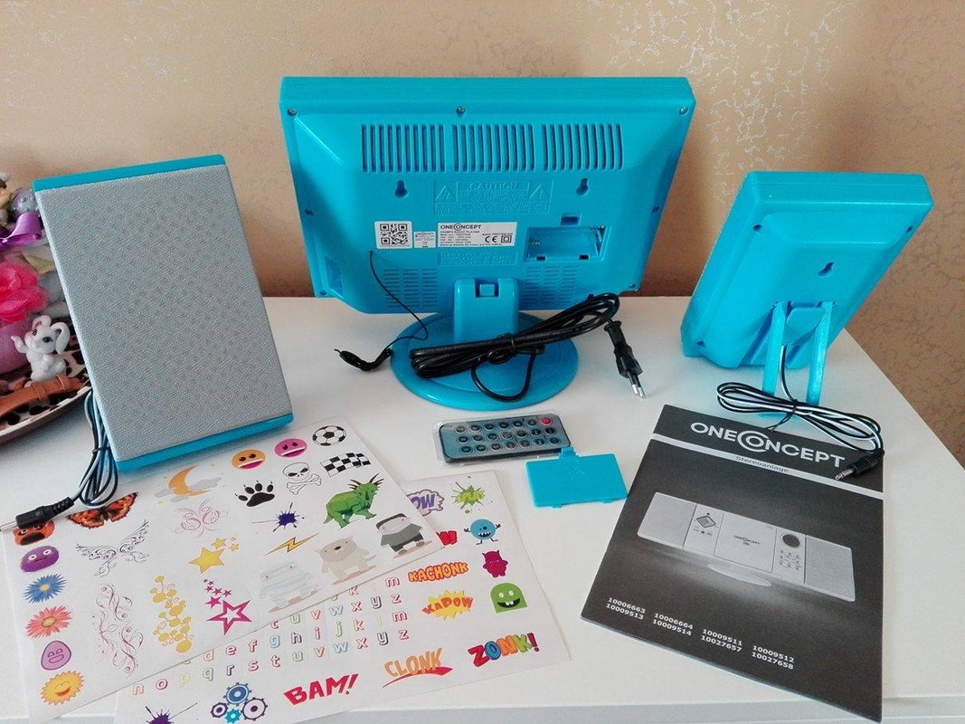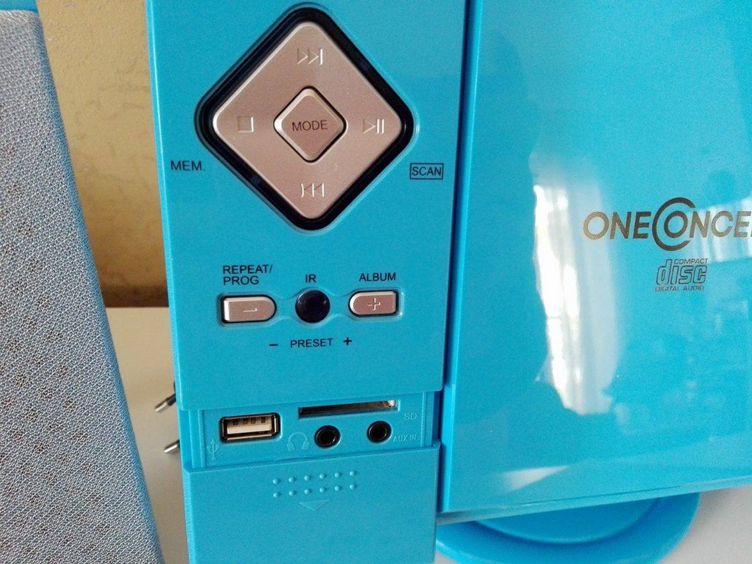 OneConcept V-12 è disponibile in diverse varianti di colore: rosa, azzurro, bianco e nero. Io ho scelto l'azzurro perché ho intenzione di regalarlo a un bambino di 11 anni e nella sua cameretta starà benissimo. Il mini stereo in questione è composto da tre parti: un corpo centrale su cui si trovano il lettore CD/MP3 e i vari comandi; due altoparlanti che possono essere staccate dal centrale ed essere posizionate a piacere, essendo dotati di supporti per reggersi in piedi.